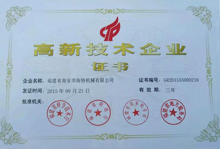 2015年12月8日,福建省科技廳政府信息公開網(wǎng)公布福建省科學(xué)技術(shù)廳通知文件(閩科高[2015]37號):根據(jù)《高新技術(shù)企業(yè)認定管理辦法》(國科發(fā)火[2008]172號)和《高新技術(shù)企業(yè)認定管理工作指引》(國科發(fā)火[2008]362號)有關(guān)規(guī)定以及《關(guān)于福建省2015年第一批高新技術(shù)企業(yè)備案的復(fù)函》(國科火字[2015]235號),認定海特機械有限公司為福建省2015年高新技術(shù)企業(yè)。